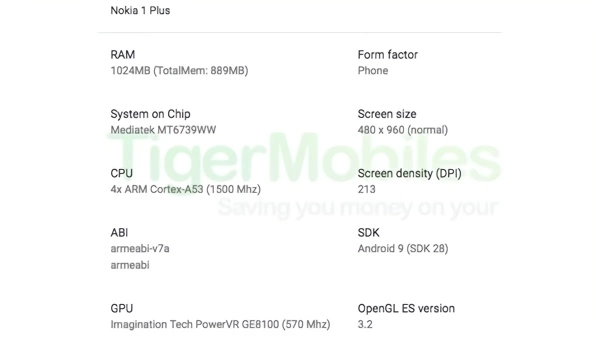 此次泄露信息包括了一些关键的配置规格,其分辨率将会升级至480x960,长宽比例为18:9。虽然并没有泄露具体的屏幕尺寸,但通过213的DPI像素密度推断,诺基亚1 Plus应是一款配备5英寸大小屏幕的设备。