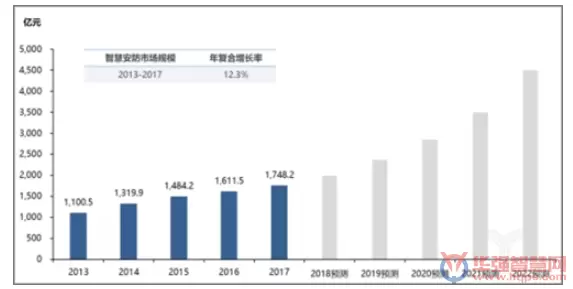 在新兴技术迭代更新的推动下,智慧化成为安防行业发展的主流形式,智慧安防逐渐成为安防企业转型升级的方向,在安防行业的占比越来越大。另外,“一带一路”战略、平安城市、智慧城市、智能交通等一系列重大项目的开展,有力促进了智慧安防系统产业的发展。2013年至2017年之间,智慧安防的市场规模由1,100.5亿元增长至1,748.2亿元,年复合增长率为12.3%。