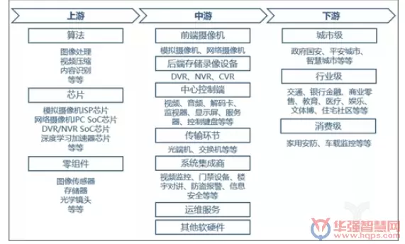 智慧安防产业链包括上游零组件供应商、算法和芯片供应商等;中游为软硬件设备设计、制造和生产环节,主要包括前端摄像机、后端存储录像设备、音视频产品、显示屏供应商、系统集成商、运营服务商等;下游为产品分销及终端的城市级、行业级和消费级客户应用。上游零部件供应商,代表企业有华为海思、索尼、中星微,还有视频算法提供商Object Video等;中游软硬件供应商、系统集成商的主力厂商包括海康、大华等。下游为终端客户,主要涉及到政府、公共行业、民用行业等。