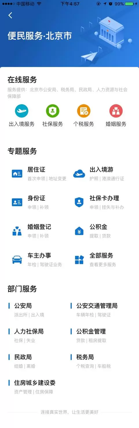 在"便民地图"中,用户可查询25个大类、70多小类的政务服务办事指南。同时,用户可直接在线进行办理22项便民服务,包括身份证预约、出入境预约、社保查询、个税查询、结婚预约等。