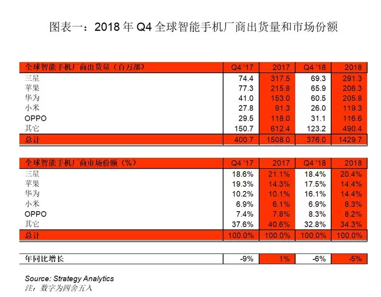 Strategy Analytics最新发布的研究报告指出,2018年Q4全球智能手机出货量年同比下降6%,为3.76亿部。2018年全年智能手机出货量下滑5%,智能手机行业首次出现全年下滑。在2018年的最后一个季度,三星以18%的全球智能手机市场份额保持第一,苹果iPhone排名第二,而华为排在第三位。