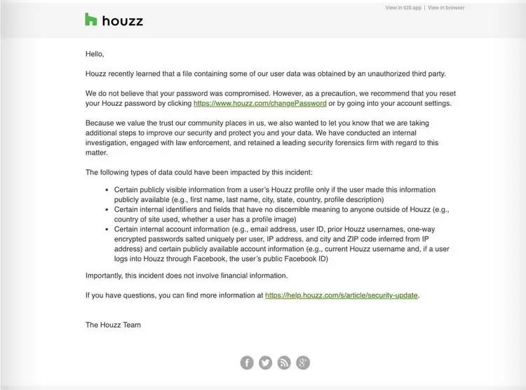 Houzz表示,来自用户的Houzz个人资料的一些公开可见信息可能会受到影响,例如姓名,城市,州,国家和个人资料描述,以及内部标识符和“对Houzz以外的任何人都没有明显意义”的字段,例如例如,该公司表示,用户的地区和位置以及他们是否有个人资料图片。