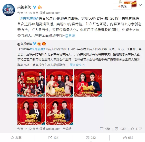 【#央视春晚#将首次进行4K超高清直播,实现5G内容传输】2019年央视春晚将首次进行4K超高清直播,实现5G内容传输,并在红包互动、内容互动上力争创造新方法,扩大参与性,实现传播最大化。你在用手机看春晚的同时,也能全方位参与到大小屏的全面联动中哦~