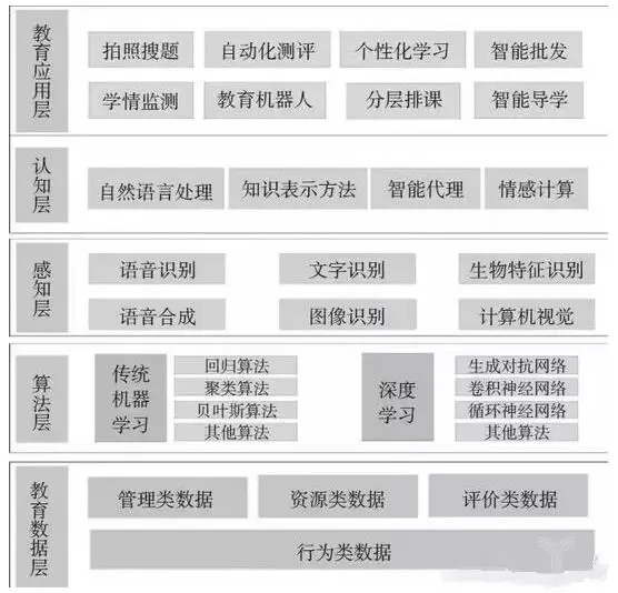 算法层是实现各类教育人工智能技术的核心,该层主要包括机器学习和深度学习两类算法。机器学习是指利用数据或以往经验,优化计算机程序的性能标准,其目标是开发能够自动检测数据模式的方法,然后使用未覆盖的模式来预测未来的数据(Alpaydin,2014),是人工智能最核心、最热门的算法。目前,机器学习在学生行为建模、预测学习表现、预警失学风险、学习支持与测评以及资源推送等方面发挥着重要作用(余明华等,2017)。深度学习是机器学习的一个子领域,致力于算法构建,解释和学习传统机器学习算法通常不能提供的高水平和低水平的抽象数据(TawehBeysolowⅡ,2017)。深度学习在文本识别、语音识别、图像识别等方面的应用已取得突破性进展,其识别准确率已远远超过传统技术的识别能力(刘勇等,2017)。