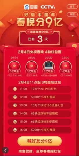 “春晚当天分9亿”活动,2月4日正式开启。在春晚四轮红包正式开启之前,从11:00-16:00还有6轮暖场红包在召唤,现金红包、小度AI音响、红旗轿车使用权也许就是你的!而春晚的9亿红包会伴随着春晚的开始一并放送。届时,跟随者春晚主持人的口播,进行相应互动,就可以领取红包!一个小Tips:现在下载或者升级到最新版百度App以及添加红包活动体现银行卡,都有机会领取最高688的红包。
