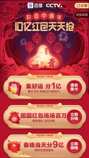 本次,百度春节红包活动的主题是“好运中国年”,从1月28日到2月4日除夕,一连8天,红包天天送。百度不光要在春晚当天狂撒9亿红包,还在百度App上线了两大红包活动“集好运 分1亿”和“团圆红包 场场百万”作为先锋部队,引爆全民热情。