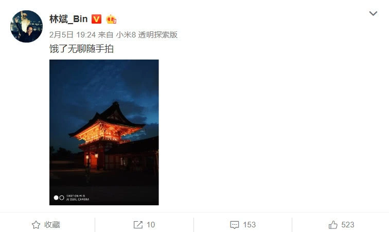 林斌的状态可以用“无聊”来形容,因为本身他自己就这样讲无聊随手拍。近一段时间林斌的工作重点一直在推广小米8的手持超级夜景之上,你看他的微博90%以上都是关于小米8手持超级夜景的。而这种“无聊”其实也是林斌的一种常态,只要是节假日他就会化身拍照狂魔的,不停的给大家分享小米机型所拍的样张。