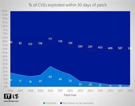 研究报告发现,根据微软安全响应中心收集的数据,在2017- 2018年期间,在分发补丁后的30天内,只有2%到3%的补丁漏洞被发现。