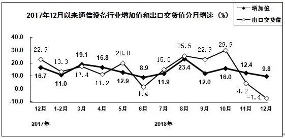 2月11日消息,根据工信部公布的《2018年电子信息制造业运行情况》显示,2018年,我国通信设备制造业增加值同比增长13.8%,出口交货值同比增长12.6%。