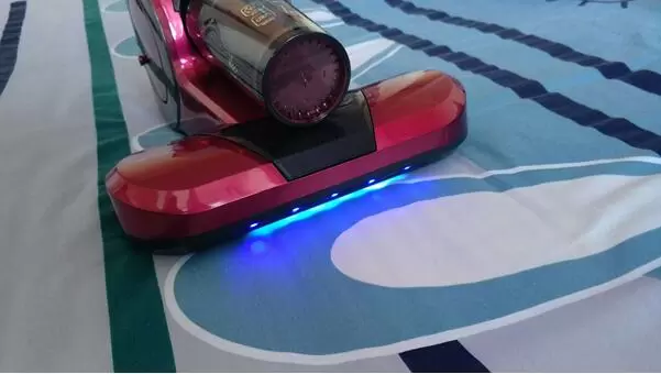 按动开关后,小狗D-615开始工作了。正前方有五颗蓝色的脏污探照灯,可以轻而易举的看到正前方是否有细微的脏污。机器工作起来噪音很小,在接触过的所有除螨仪中是这款的噪音控制是非常到位的。