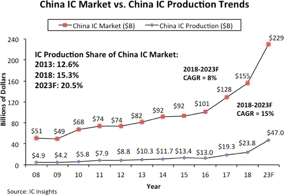 自2005年以来中国大陆一直是集成电路最大的消费市场。根据IC Insights最新报告显示,近年来中国目标大幅提升集成电路自给率的目标远未实现。