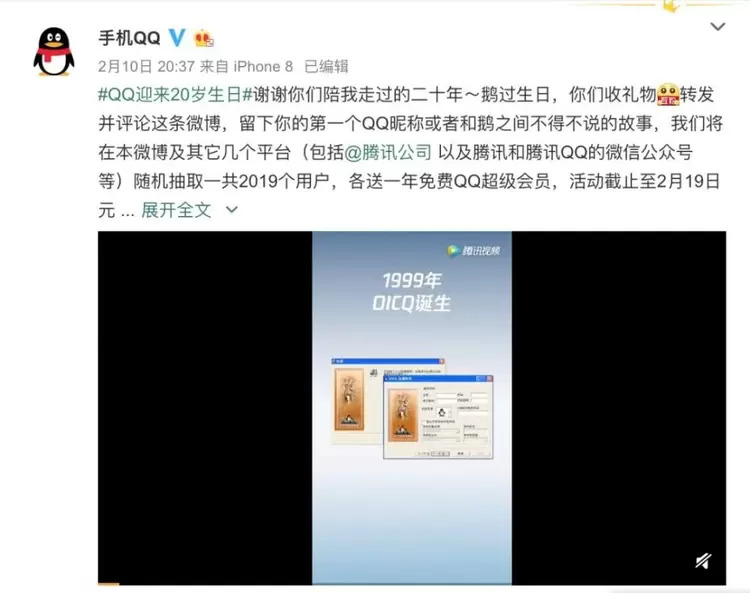 2019年2月10日,QQ迎来了自己的20岁生日。相伴20年,80后早已结婚生子,最小的一批90后,也已进入双十年华。时光的洪流里,那些发生在QQ上的故事成为青春的美丽注脚。