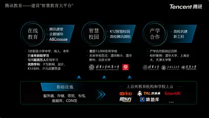 腾讯在教育领域搭建了以教育云、视频云、AI技术为核心的基础设施,推出了企鹅辅导、腾讯课堂、ABCmouse在内的线上教育平台;与大中小学合作,推送K12领域和高校领域的智慧校园建设;同时推进产学合作,联手高校共建新工科教育生态。