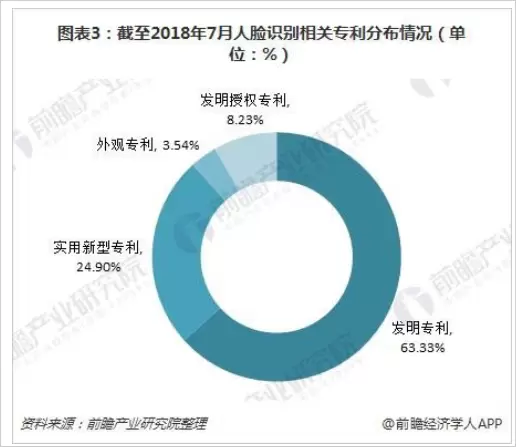 截至2018年7月2日,我国人脸识别技术专利申请总量达到10404项。其中,发明专利数最多,达到6589项,占比为63.33%;实用新型专利数其次,为2591项,占比为24.90%;外观、发明授权专利数占比分别为3.54%、8.23%。