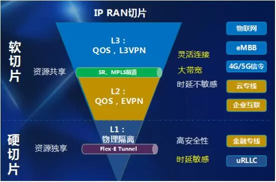 支持硬隔离和软隔离的层次化网络切片方案,满足不同的网络需求。对于一些安全要求一般的业务,IP RAN网络可提供基于L2或L3逻辑隔离的网络软切片,通过分组复用,最大化的利用带宽;对于uRLLC和金融政企专线等业务要求独享资源、低时延和高可靠性,承载网络可提供基于L1 TDM隔离的网络硬切片。IP RAN层次化切片提供了按需定制能力,可以实现投资的最大化,是性价比最高的方式。