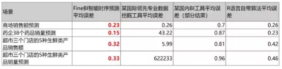 1、国内BI工具只预测了部分产品,因为预测多产品十分复杂,表格中数据是预测的部分平均误差;