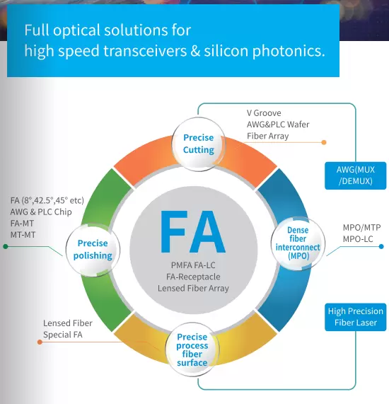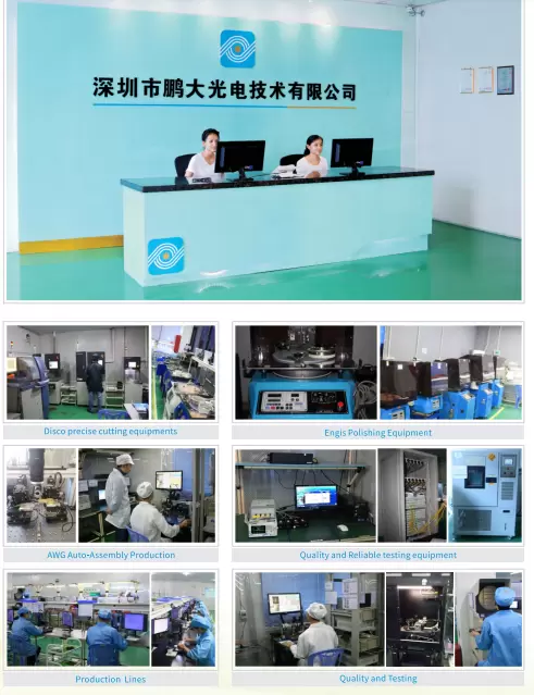 鹏大光电引以为豪的就是其使用高精度的V槽基材,拥有独特的工艺设计和高精度的加工设备、工艺保证FA产品具备高精度、小型化、高可靠性、高耦合效率。同时针对硅基AWG(MUX\DEMUX)芯片,尤其是41°角磨切加工,整体良率可以控制在95%以上。并配备全参数自动耦合测试设备,可以为晶圆厂家提供后端封装,这些工艺设计、精良的设备都让鹏大光电积累了强大的技术实力基础。