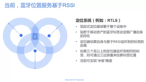 基于位置的蓝牙服务解决方案通常分为两类:接近类解决方案和定位系统。接近类解决方案可以使用蓝牙标签来周期性广播自身的存在,定位设备通过识别已知标签来通过信号强度来估算距离,从而实现物品的追踪。例如如果用户给钱包贴上这样一个标签,找不到钱包的时候,通过手机就能获知钱包所放置的大致范围;在定位系统解决方案中,定位器需要扩展至三个及以上,定位设备就能实现上述的三边测量算法,精度可达到“米级”,从而实现定位。