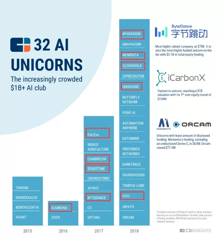 与区块链等现象级“风口”不同,AI到现在依然是互联网上的“当红炸子鸡”,没有一点风停的迹象。2月,CB Insights发布全球32家AI独角兽公司榜单,大多数上榜企业来自于美国和中国,其中美国有17家,中国有10家。中国俨然已成与美国比肩的AI高地。