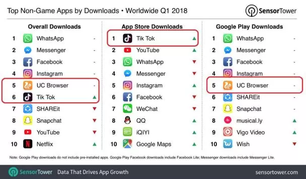 2018Q1移动应用全球下载量排名:UC第5 抖音第6
