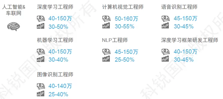 国企及大型企业急需相关领域的领军人物,以及能够制定标准并落地的执行人员;一二线互联网公司急需研发、AI类型的科学家、研发总监、核心工程师等高级人才。由于该领域人才稀缺,薪资增幅均在30%以上,其中深度学习、计算机视觉、NLP等职位薪酬上涨最快,跳槽涨幅可多达40-50%。