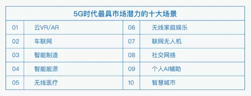 综合来看,与前几代移动网络相比,5G的关键能力突破使得应用场景的丰富性上也将有飞跃发展。此外,5G为移动运营商及其客户提供了极具吸引力的商业模式。为了支撑这些商业模式,未来网络必须能够针对不同 服务等级和性能要求,高效地提供各种新服务。有研究机构总结了5G时代最具市场潜力的十大应用场景,也无外乎是由于5G在移动通讯上的关键能力所解决的连接速率和质量的所带来的改变。