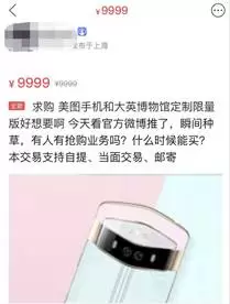 美图手机大英博物馆限量版定价6999元,但尚未开始预售。目前已有不少淘宝、微商第三方商家准备开通代抢代购业务。而许多网友也在微博、闲鱼发布高价求购求抢帖子,可见新机已是未卖先火的节奏。