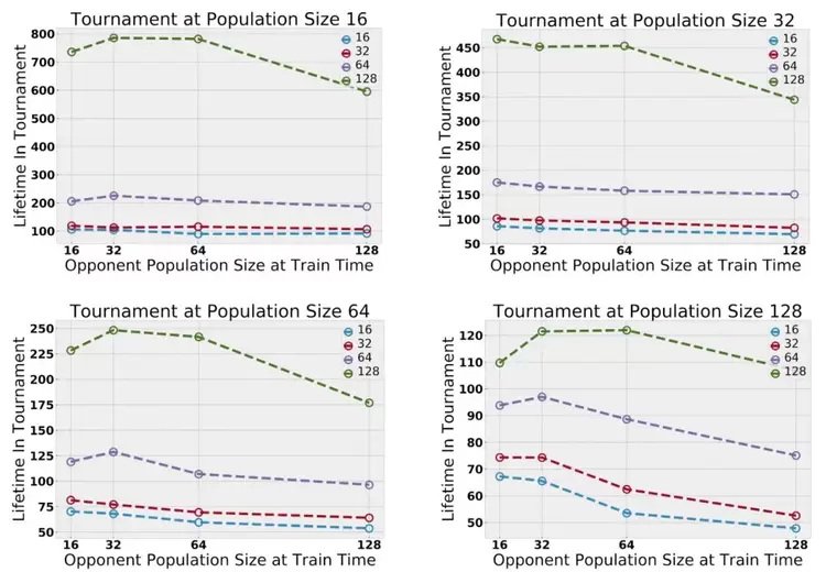 有趣的是,他们还发现,增加智能体的种群规模可以促使它们分散到地图的不同区域,而在较大环境中训练的智能体“始终”优于在较小环境中训练的智能体。