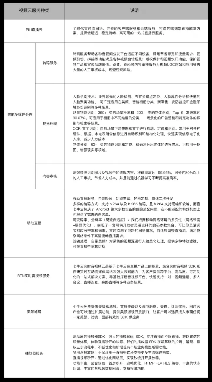 当下,七牛云视频云服务包括PILI直播云服务、智能多媒体处理服务(转码、视觉处理、内容审核)、移动直播服务、RTN实时音视频互动服务、美颜滤镜、播放器产品,基于以上产品可以组合出多种视频服务行业解决方案。具体如下图: