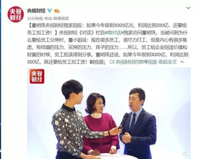 3月5日,当记者问到为什么要给员工分房时,董明珠表示,现在很多员工,很尽力打工,但是内心有很多焦虑,有结婚的压力、买房的压力、孩子的压力……所以,员工给企业创造价值和财富的时候,员工应该得到分享。董明珠还表示,如果今年做到3000亿,利润达到300亿,就还要给员工加工资!