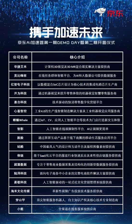 京东AI加速器则通过招募全球各个行业的AI初创企业,与京东自有AI技术和场景进行协同发展,生态共建。在二期加速器企业的榜单中也有所体现:华捷艾米主要从事计算机3D视觉及3D MR混合现实解决方案的提供,未来可以结合京东零售、物流、金融全价值链场景进行产品创新;智影作为国内首批人工智能在线视频制作平台,可以基于京东AI TTS等AI技术能力进行智能短视频制作的探索。