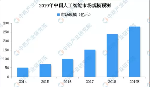 2017年中国人工智能市场规模将达到152.1亿元,增长率达到51.2%。随着人工智能技术的逐渐成熟,科技、制造业等业界巨头布局的深入,应用场景不断扩展,2018年中国人工智能市场规模约为238.2亿元,增长率达到56.6%。预计2019年,中国人工智能市场规模将近280亿元。