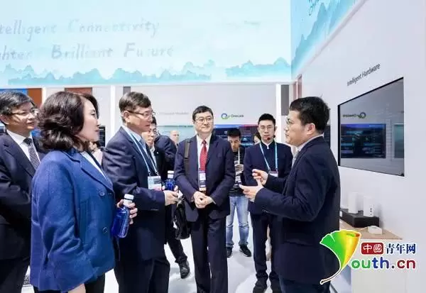 中国移动通信集团总裁李跃在中移物联网有限公司总经理乔辉的陪同下参观物联网展区。中移物联网有限公司 供图