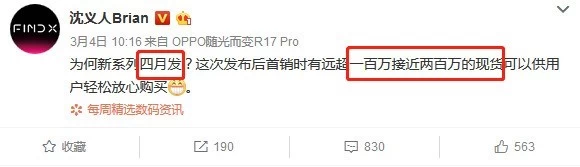 回归此次OPPO的新机我们也能看出,无论是10倍混合光学变焦;骁龙855的强大性能,还是4065mAh大电池,都满足了我们对旗舰手机的所有想象,加之OPPO有着强大的生产与备货能力,免去了大家抢购的尴尬。由此就不难判断,沈义人之所以有底气频频为大家爆猛料,拉升用户对这款新机的期待值,无疑是源自其对自家产品的信心。