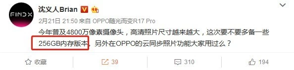 沈义人表示OPPO新机将会多备一些256GB大存储版本