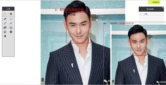 下面的左图是一个错误的人脸标注,与标准的贴合度不够,正确的标注应该如右图。