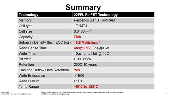 图1:英特尔已量产的嵌入式非易失性存储器MRAM产品规格参数