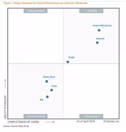 2018年,IaaS 魔力象限的供应商只有六家:AWS、微软、Google、Alibaba Cloud、Oracle以及IBM。甲骨文后面一大波厂商都已不在其列。