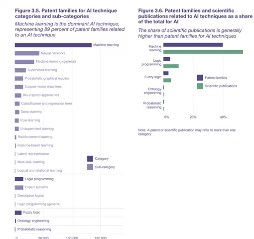 在AI技术方面,机器学习占据主导地位,年增长高达28%。在机器学习中,目前正在革新AI的具体技术包括深度学习和神经网络。其中,2013年到2016年,涉及深度学习的专利提及数量有着平均175%的增长速率,神经网络的增长率则为46%。这两项技术也是当前AI研究和应用的关键基础技术。