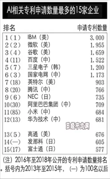 而随着AI上升到国家战略层面,AI专利申请无疑成为科技公司的新战场。日经最新的报道指出,从2016到2018年,AI专利申请50强企业数量,中国反超美国。