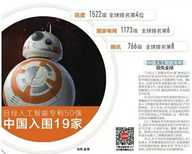 “日经人工智能专利50强”榜单显示,在2016年至2018年的3年中,跻身该榜单的中国企业数量从8家激增至19家。数据显示,百度专利申请数量达到1522项,全球排名第4位,国家电网公司排名第6,专利数量为1173项,腾讯排名第8,专利总数为766项。
