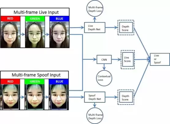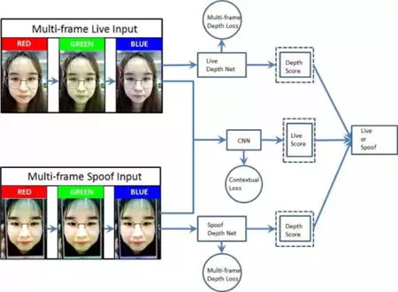 就是在进行活体检测判断的时候,引入局部帧间信息。简单理解,就是把编码好的特定序列光线打在被检测物体上时会产生变换的反射光,对变换的反射光图像进行局部帧间处理,如此便可得到含有一定时序信息的特征。经过这种的特征提取改进,提取的特征数量扩大到了单帧图片的