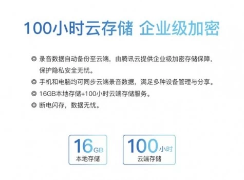 搜狗智能录音笔C1不仅提供了本地16GB的大容量存储空间,同时还支持100小时的云端自动同步存储功能。值得一提的是,云端服务由腾讯云提供,腾讯云企业级加密存储保障,不仅保护隐私安全,也确保了录音数据的可靠性。