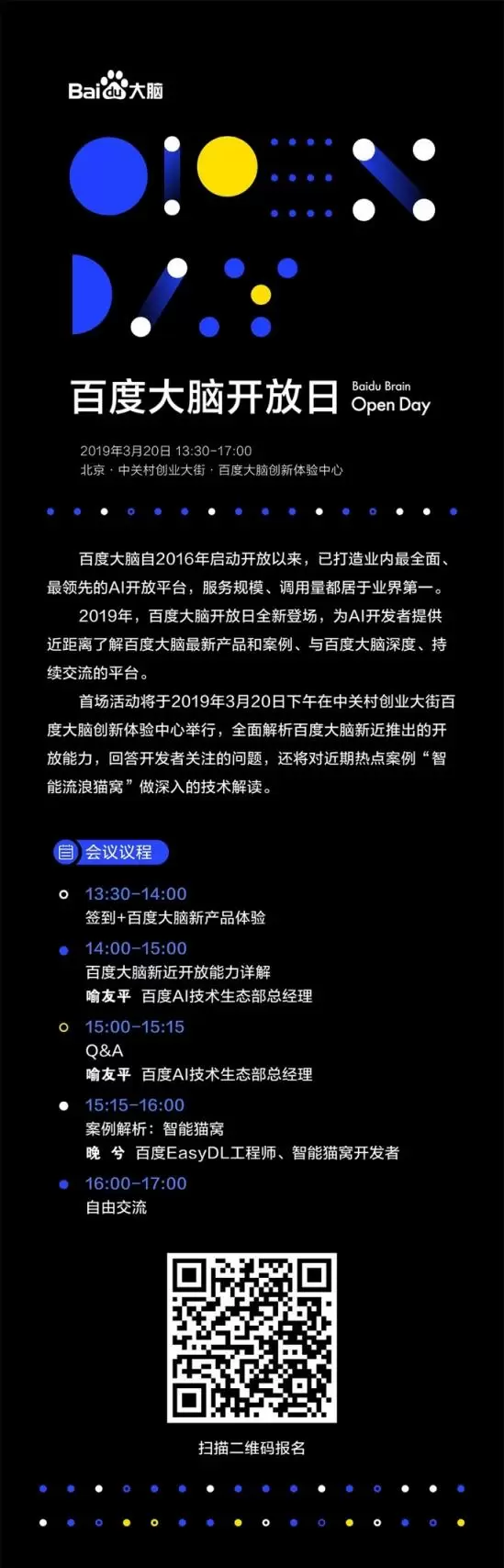 3月20日下午,首场百度大脑开放日将在北京中关村创业大街百度大脑创新体验中心举行。百度AI技术生态部总经理喻友平将全面解析百度大脑平台与生态;展示新近推出的开放能力与应用场景;就开发者关注的问题做深入交流。此外,百度大脑工程师晚兮将详解近期热点案例“智能猫窝”的研发。