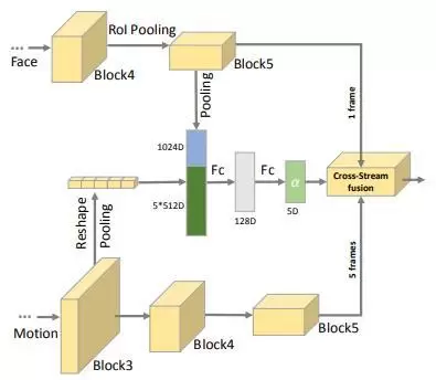 同时,论文作者结合心理学知识(即说谎者由于紧张, 其面部表情和身体姿势往往会不一致),发现双流法中的图像特征和光流特征逐帧对应匹配并不是视频测谎的最优解决方案。因此,作者提出了跨帧的双流网络 (cross-stream network)——这种网络可以捕捉面部表情和身体姿势不一致的关系。利用这种网络,视频中的每一个面部表情帧都隔一定间距匹配五个光流帧,并让模型自动学出这五帧之间的权重关系。此外,论文作者还将时间流 ResNet 的 block3 使用全局池化层将其变为向量,使得模型经过两组全连接和一个 softmax 层后,能够学习到五个动作帧之间的权重关系。通过学习这个模块,模型具有了对不同的动作帧赋予不同权重的能力。