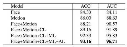 为了验证模型的不同模块均是有效的,论文作者进行多组消融实验。从表 1 可以看出,与只使用 face 或者只使用 motion 相比,同时利用面部和动作两个信息的模型所取得的效果有较大的提升。而在加入了 cross-stream 的匹配 (CL) 之后, 模型精度有了进一步的提升。此外,为了克服数据量过小的问题,,作者在模型中加入了元学习 (ML) 和对抗学习 (AL) 模块, 这些都对提高模型的鲁棒性有很大的帮助。