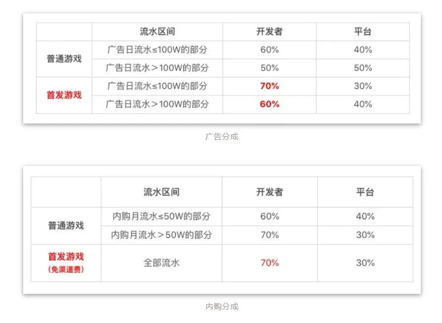 今年2月,抖音正式上线了小游戏,并且从广告和内购两方面为小游戏的开发者提供了完备的商业支持体系。在字节跳动的平台上首发的小游戏除了获得流量上的扶持之外,还拥有首发期间免除渠道费的特权及更加优惠的分成比例。从现有的分发路径来看,字节跳动对小游戏的扶持同样也适用于原生App游戏。