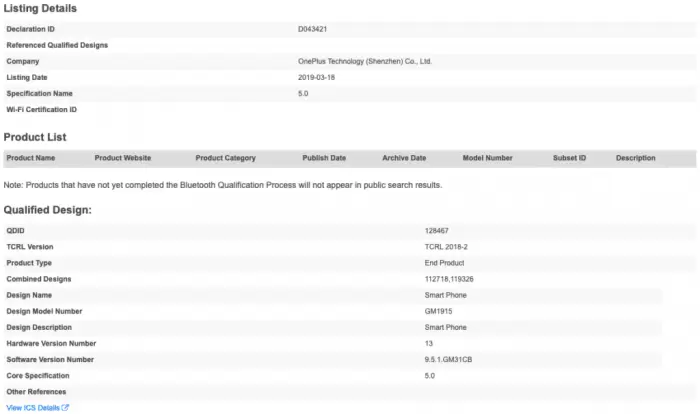 一加GM1915型号获蓝牙SIG认证 可能是一加7或5G智能手机