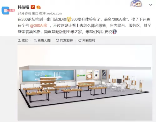 不过不少网友表示,360Ai家的设计风格十分眼熟,仔细对比发现,其整体和小米之家非常相似。从图中可以看到,店面主体是产品体验区,长方木桌整齐摆开,产品分两排陈列,与小米如出一辙;还有墙面海报的铺陈以及服务台的设计,都和小米类似。可以说360Ai家基本是小米之家的复刻版。