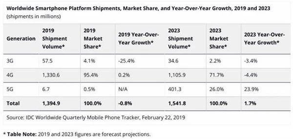 因为当下并没有很多与5G智能机功能匹配的内容,因此5G手机发布初期销量可能会非常低迷。此前IDC推测今年5G手机出货量并不多,但更换5G手机会成为接下来几年内消费者更换手机的主要推动力,因此5G手机销量会在接下来的几年内逐渐攀升。而LG电子第一款5G智能机G8 ThinQ 5G也有望在下月推出,用于刺激5G智能手机市场。